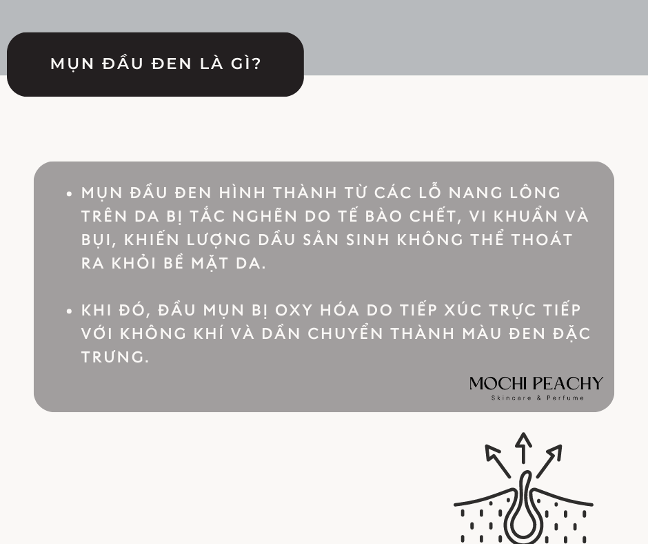 - Mụn đầu đen hình thành từ các lỗ nang lông trên da bị tắc nghẽn do tế bào chết, vi khuẩn và bụi, khiến lượng dầu sản sinh không thể thoát ra khỏi bề mặt da. Khi đó, đầu mụn bị oxy hóa do tiếp xúc trực tiếp với không khí và dần chuyển thành màu đen đặc trưng.