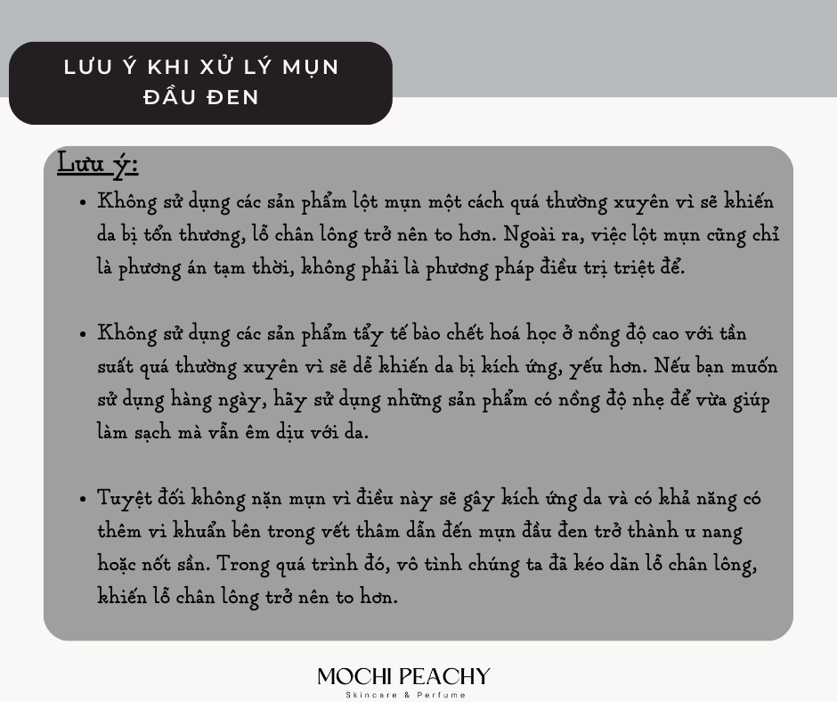 Lưu ý: Không lạm dụng lột mụn đầu đen vì phương pháp này dễ khiến da bị tổn thương nghiêm trọng, da càng trở nên nhạy cảm hơn, lỗ chân lông to hơn, vùng da đó ngày càng yếu đi và mụn sẽ xuất hiện nhiều hơn. Bên cạnh đó, không nên xông mặt hay nặn mụn đầu đen vì các phương pháp này thường không đủ độ an toàn, dễ gây tổn thương da. Đồng thời, cần hạn chế trang điểm khi bị mụn và nếu trang điểm thì cần tẩy trang kỹ càng để tránh cặn trang điểm tồn tại trên da sẽ làm bít tắc lỗ chân lông gây mụn đầu đen